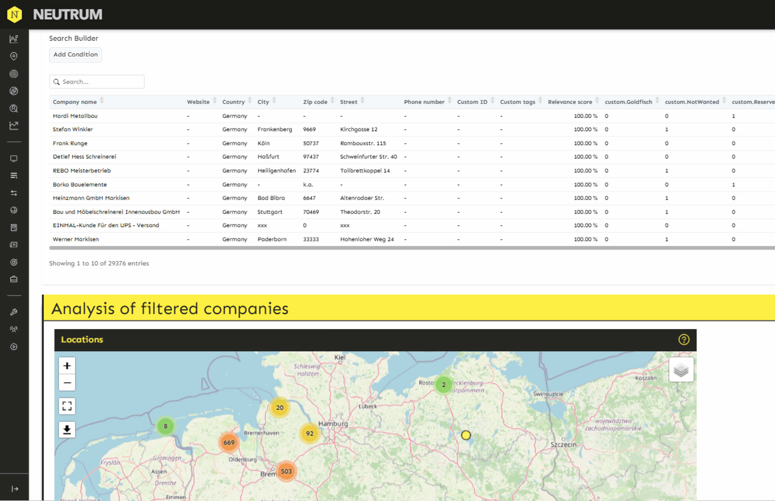 NEUTRUM brings together data from company registries, websites, ratings, job platforms, advertising and more to find great partners for you. If you connect existing client data, it reveals success factors and predicts which leads will become A clients.